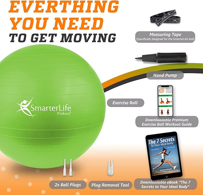 - WHAT'S INCLUDED: We include the exercise sitting ball, an exercise ball pump, inflation measuring tape, two (2) ball plugs with a removal tool, an exclusive downloadable complete body workout guide, and a downloadable eBook called "The 7 Secrets to Your Ideal Body." Also downloadable is our “Premium Exercise Ball Workout Guide” which picks up where the included-in-the-box “QuickStart Exercise Guide” leaves off. The download instructions are included in a sheet in the box.