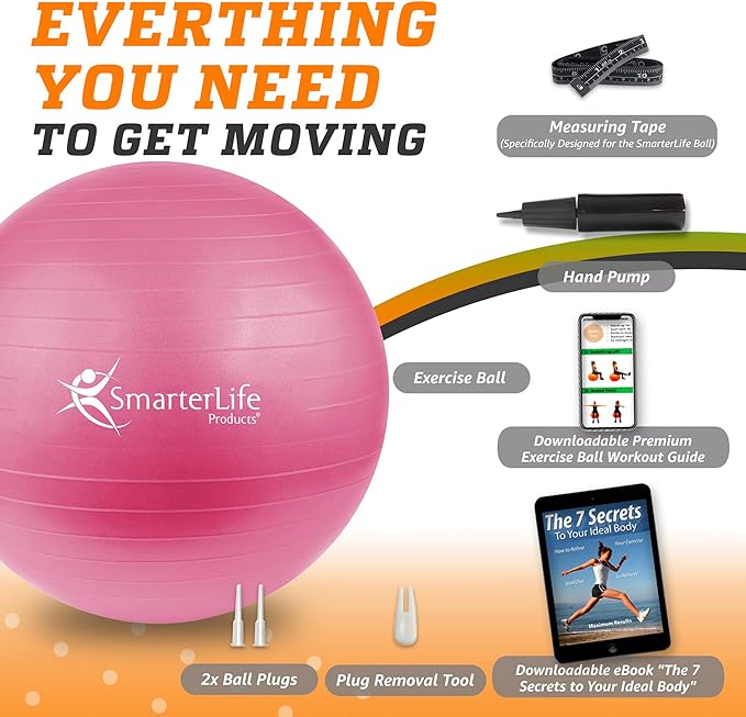 • WHAT'S INCLUDED: We include the exercise sitting ball, an exercise ball pump, inflation measuring tape, two (2) ball plugs with a removal tool, an exclusive downloadable complete body workout guide, and a downloadable eBook called "The 7 Secrets to Your Ideal Body." Also downloadable is our “Premium Exercise Ball Workout Guide” which picks up where the included-in-the-box “QuickStart Exercise Guide” leaves off. The download instructions are included in a sheet in the box.