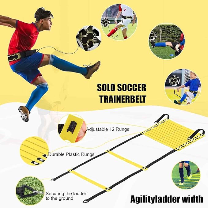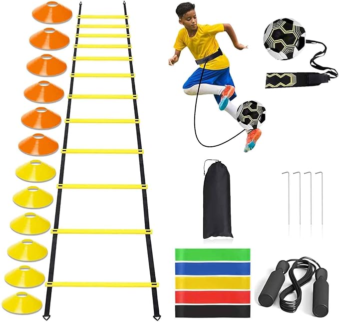 - 【Complete Sports Training Set】This is a comprehensive soccer training equipment. Each kit includes a 20ft 12 Rungs agility ladder, 12 soccer cones, 1x solo soccer/volleyball trainer, 4 steel stakes for added stability, 1 x jump rope, 5 loop resistance bandsand a carrying bag.