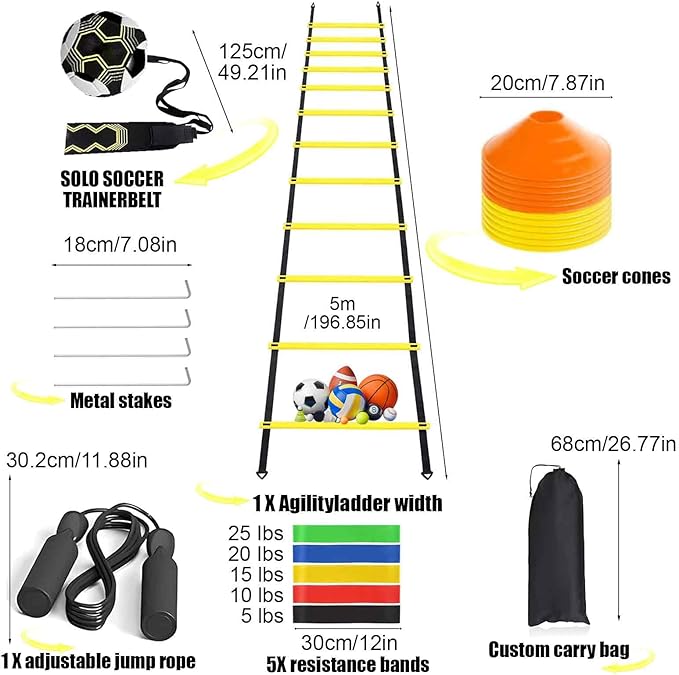 • 【Complete Sports Training Set】This is a comprehensive soccer training equipment. Each kit includes a 20ft 12 Rungs agility ladder, 12 soccer cones, 1x solo soccer/volleyball trainer, 4 steel stakes for added stability, 1 x jump rope, 5 loop resistance bandsand a carrying bag.