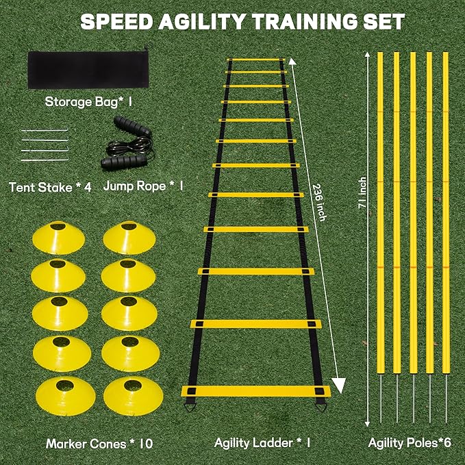 • Comprehensive Agility Training Kit: This soccer training equipment set includes 6 adjustable agility poles, a 19.6 ft speed agility ladder, 10 soccer cones, a jump rope, 4 ground stakes, and a carry bag. Perfect for a complete speed and agility training routine.