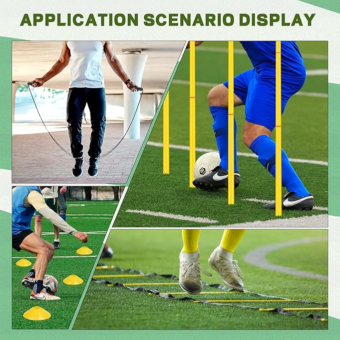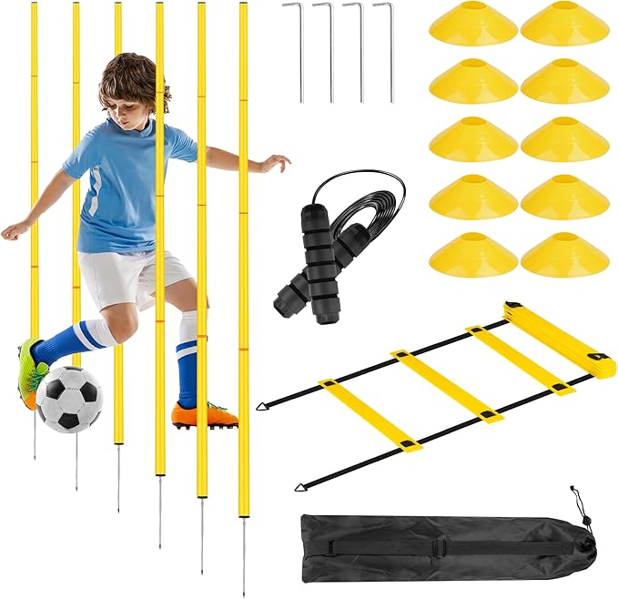 - Comprehensive Agility Training Kit: This soccer training equipment set includes 6 adjustable agility poles, a 19.6 ft speed agility ladder, 10 soccer cones, a jump rope, 4 ground stakes, and a carry bag. Perfect for a complete speed and agility training routine.