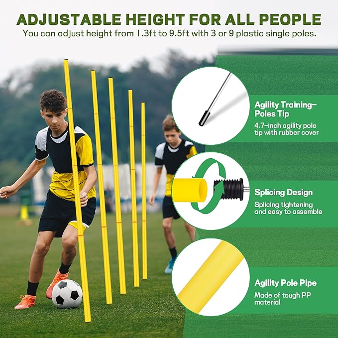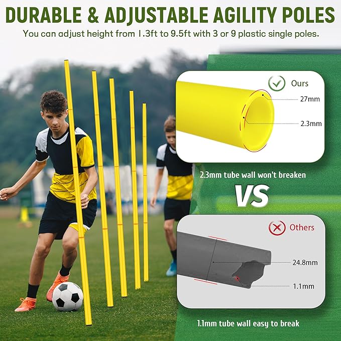 - Adjustable & Durable Agility Poles: The 6 detachable soccer agility poles can be customized to a height of 70.8 inches/1.8 meters. Each pole consists of 4 sections, providing flexibility for all levels of soccer and football training.