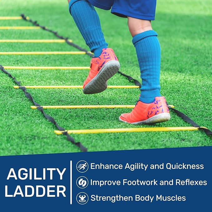 - 【Agility Ladder】 Agility Ladder (20 feet) help improve quickness, and coordination, enabling players to perform intricate movements with precision during matches. The agility ladder is a fundamental tool for improving footwork and quickness. Its layout allows athletes to perform a wide range of precise foot movements and develop coordination on the field or court.