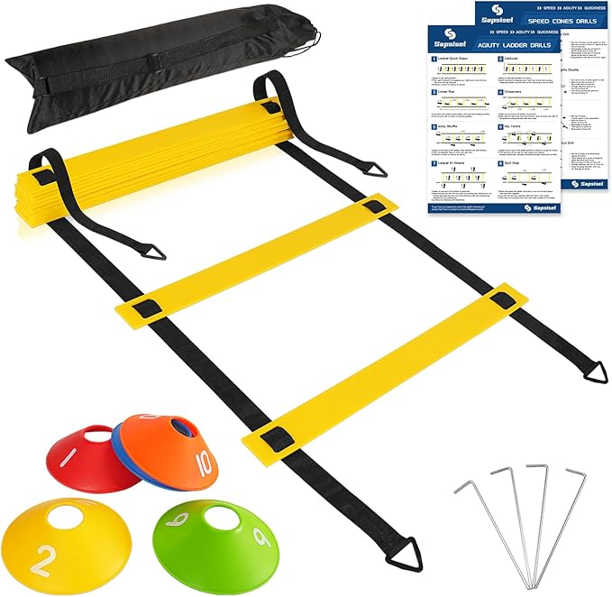 - 【Agility Ladder】 Agility Ladder (20 feet) help improve quickness, and coordination, enabling players to perform intricate movements with precision during matches. The agility ladder is a fundamental tool for improving footwork and quickness. Its layout allows athletes to perform a wide range of precise foot movements and develop coordination on the field or court.