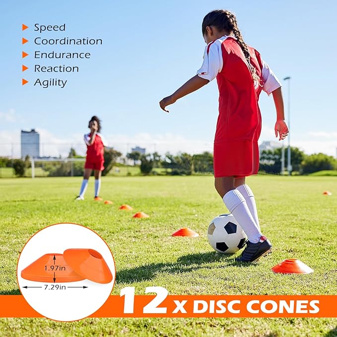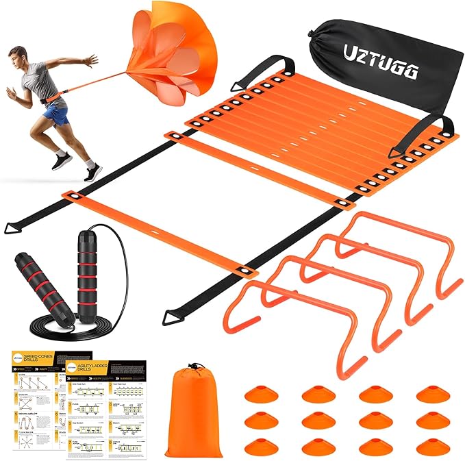 - Enhance Your Athletic Power - Our speed and agility training set is designed to help you unleash your full athletic potential. With a comprehensive set of tools including an 20-foot advanced agility ladder with fixable 4 stakes, 4 Agility hurdles,12 yellow disc Soccer Cones, Running Parachute, you'll be able to push your limits and achieve your fitness goals like never before.