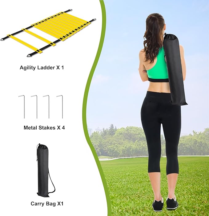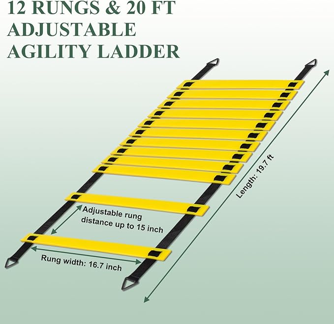 - 【Adjustable Agility Ladder】Our agility ladder is designed with 12 rungs, the spacing between the rungs can be adjusted to 15 inches using nylon straps, and the total length can reach 20 feet. Suitable for different levels, skill sets and exercises to improve your speed, agility, coordination and leg strength.