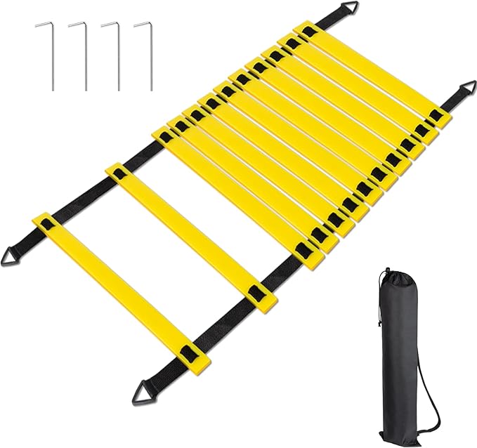 • 【Adjustable Agility Ladder】Our agility ladder is designed with 12 rungs, the spacing between the rungs can be adjusted to 15 inches using nylon straps, and the total length can reach 20 feet. Suitable for different levels, skill sets and exercises to improve your speed, agility, coordination and leg strength.
