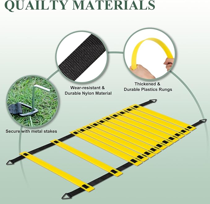 • 【Portable and Easy to Install】 This speed and agility training equipment is lightweight and easy to store. The fitness ladder comes with a carry bag, which is small and easy to carry with you, very convenient for you to train anytime, anywhere. It can be secured to the lawn with the included steel spikes for safe exercise on the grass or in the park.