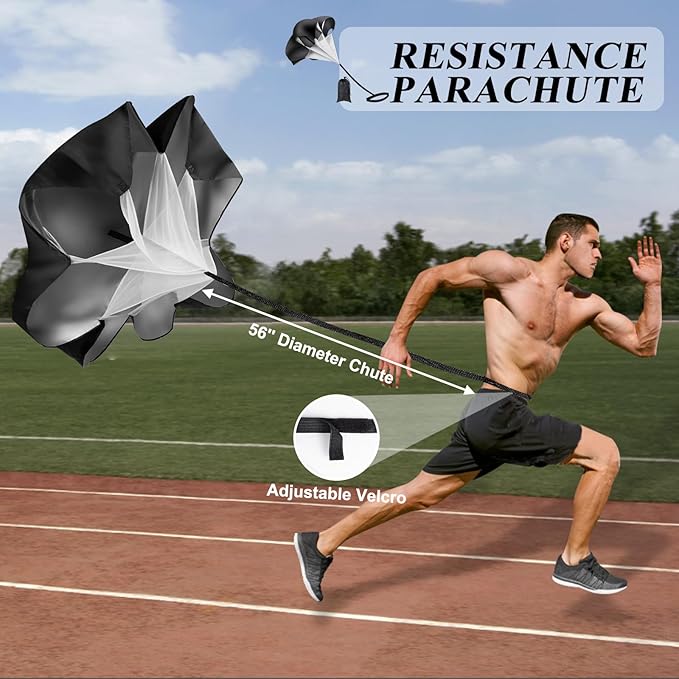 - 【Agility Training Equipment Set】Our soccer training equipment includes a 20-foot adjustable agility ladder, 4 steel spikes, a resistance parachute, a jump rope and 5 loop resistance bands. Perfect for professionals, beginners, children, and anyone who wants to improve speed, agility, and coordination.