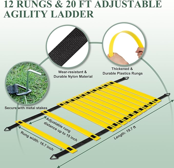 - 【Adjustable Agility Ladder】Our agility ladder is designed with 12 rungs, the spacing between the rungs can be adjusted to 15 inches using nylon straps, and the total length can reach 20 feet. Suitable for different levels, skill sets, and exercises. Perfect for training at home, in the gym, etc. It can also be secured to the lawn with the included steel spikes for safe exercise on the grass or in the park.