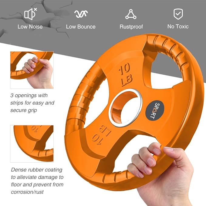 • 💪FEATURE: SPART weight plates have a solid iron core and slide rubber surface. This design can protect the floor from damage and ensure enough weight when you do exercise. The strong steel ring insert can help you assembly the barbell easily. The three holes are designed for grip according to your hands and you can do weightlifting exercise with single plate as well.