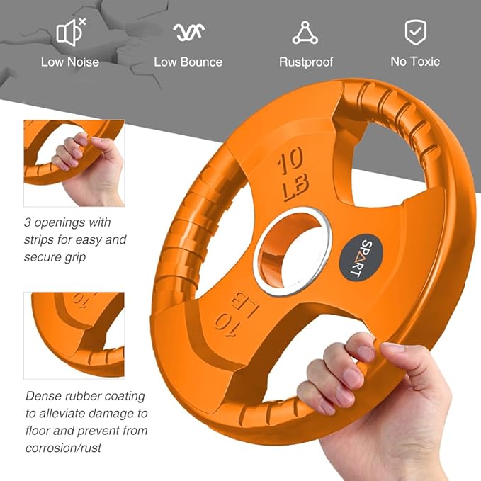 - 💪FEATURE: SPART weight plates have a solid iron core and slide rubber surface. This design can protect the floor from damage and ensure enough weight when you do exercise. The strong steel ring insert can help you assembly the barbell easily. The three holes are designed for grip according to your hands and you can do weightlifting exercise with single plate as well.