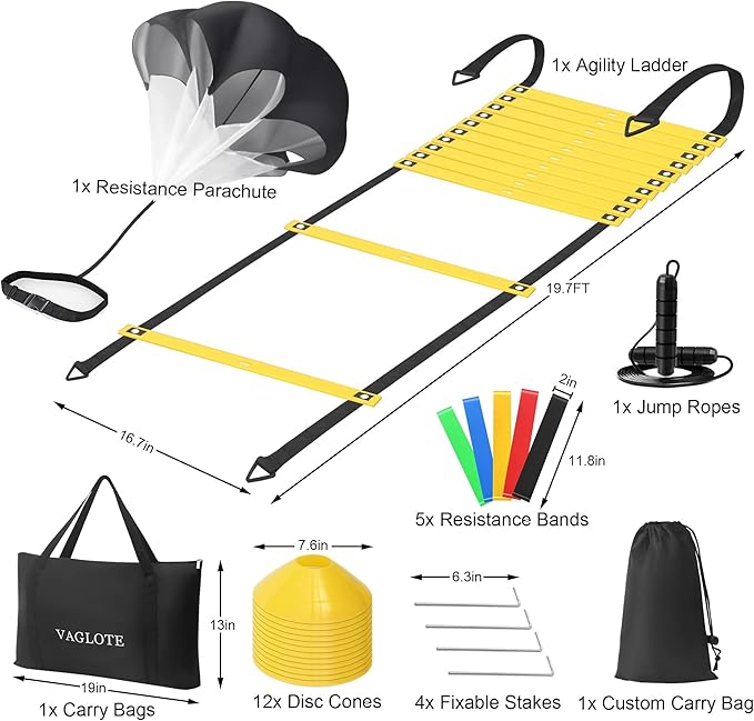 - ✅【Agility Ladder Speed Training Equipment Set】The soccer agility training equipment includes 19.7ft agility ladder, parachute for speed training, jump rope, 5 resistance bands, 4 fixable stakes, 12 disc cones and carrying bag. It can meet your training requirements and make your life more fitter.