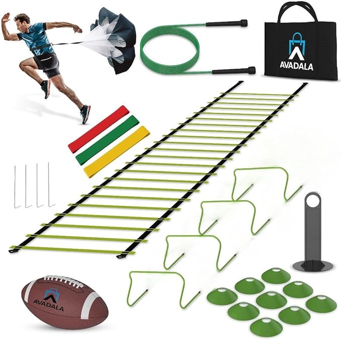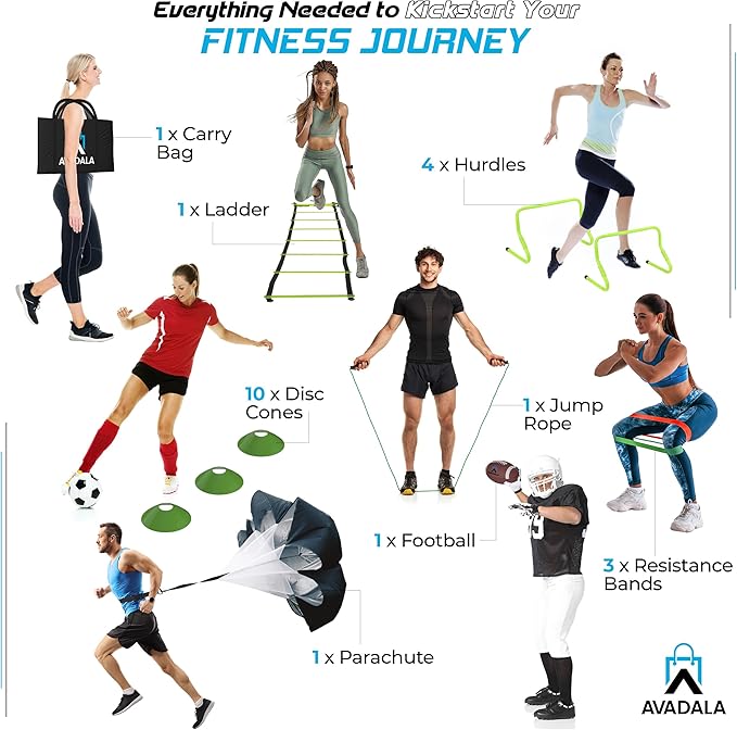• COMPLETE TRAINING KIT - Maximize your athletic potential with our all-in-one speed and agility training equipment set. This comprehensive kit includes adjustable hurdles, disc cones, a jump rope, a parachute, a ladder, a football, and bands—perfectly designed to enhance your performance and help you master any sport.