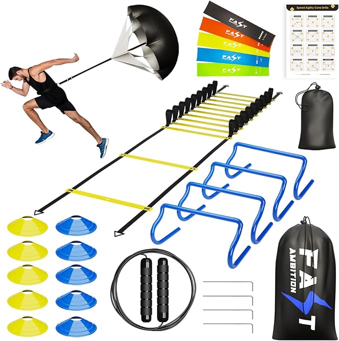 • IMPROVE SPEED, STRENGTH & AGILITY with the Fast Ambition speed ladder agility ladder set and blow your opponents out of the water. This speed agility training equipment set is perfect for any athlete looking to maximize their potential