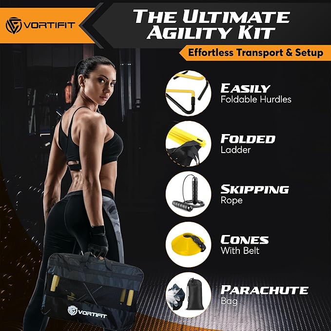- Agility training equipment set - Features a 20-foot ladder, 4 Two-Height Hurdles, 12 cones with Carry Belt, and a Running Parachute with Bag. Ideal for all—beginners to experts—for comprehensive agility training.