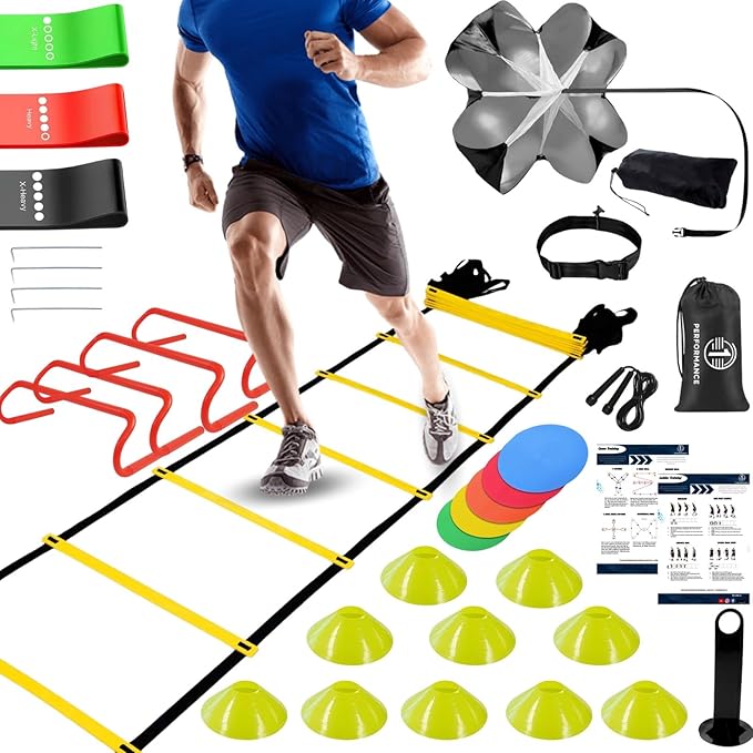 - TOTAL VERSATILITY: This kit offers a wide variety of training tools that allow you to work on different aspects of your fitness, from agility and speed to endurance and strength. With options like the jump rope, agility hurdles, speed agility ladder and resistance bands, you have everything you need to create complete workout routines mixing the soccer cones and ladder