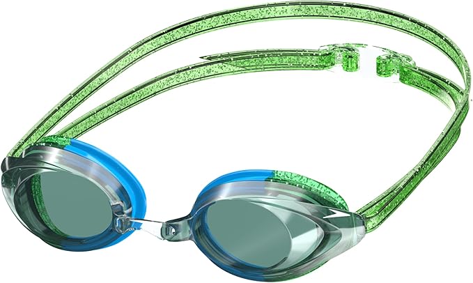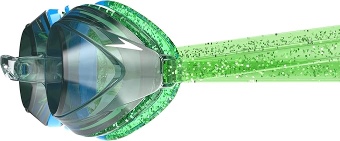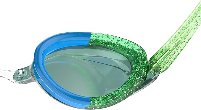 - Embedded metallic flakes on translucent straps and gaskets add sparkle to your swim