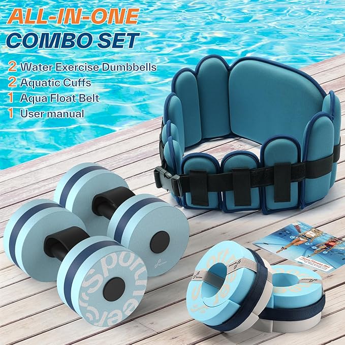 - 【All-In-One Combo Set】: This pool exercise equipment set has all the essential tools you need for aquatic exercise. It includes 2 high-density EVA foam water weights, 1 swimming belt, 2 water ankle weights.
