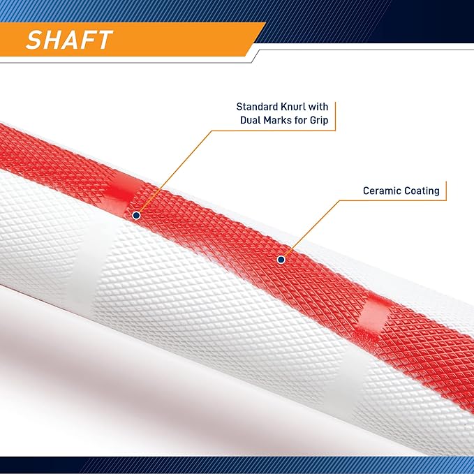 - Lighter knurling marks on the shaft of the Olympic bar are coated with ceramic, which increases friction between your hands and the bar, therefore improving overall grip