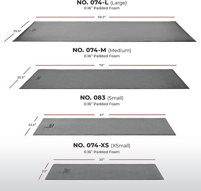- 【SIZE OPTIONS】 Our 4.2 mm thick mat comes in 4 sizes; easily fit any equipment of any size while keeping your room nice and tidy. EXTRA SMALL - 30 x 20 inches | SMALL - 51 x 23.5 inches | MEDIUM - 79 x 35.5 inches | LARGE - 90 x 39.5 inches.