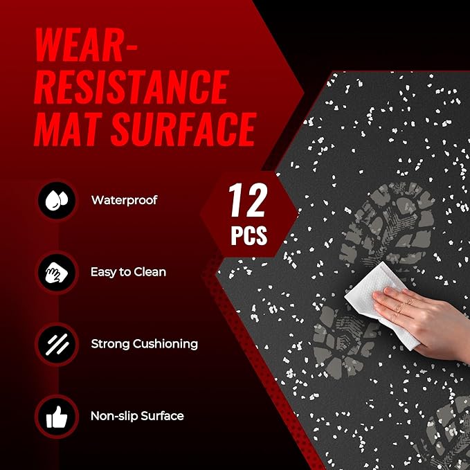 - 【All Places Usable】12 tiles, each with a thickness of 0.56 inch and a size of 24in x 24in, covers 48 Sq Ft. You can place this flooring mat wherever you need it! It's suitable for a garage, gym, family fitness room or playroom.