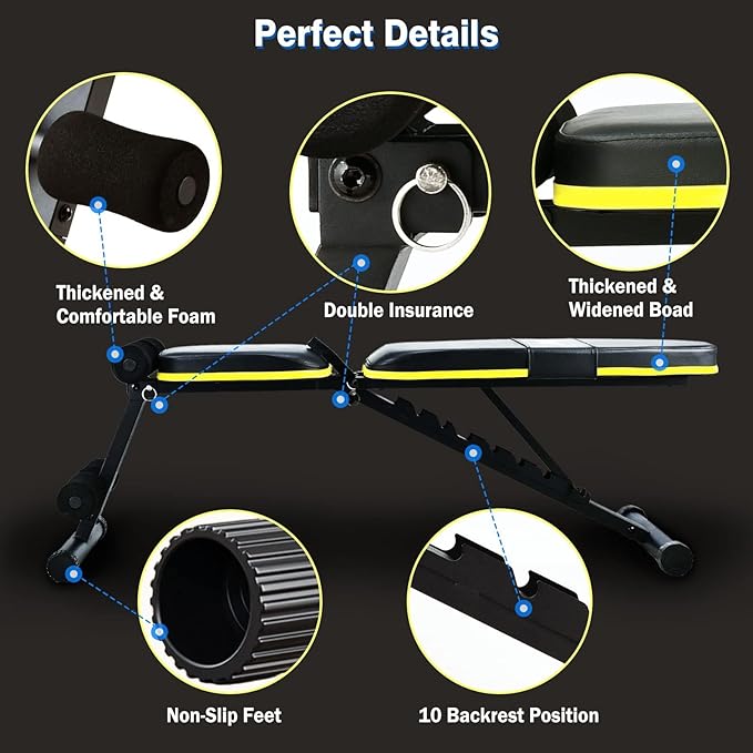 - 【Quick Adjustment & Safe Locking】 10 backrest position adjustment workout bench. It has a safe serrated back cushion adjustment design. 1second adjustment position and secure locking. Depending on your training needs, putting it in drop, incline or flat position. You can move more freely, comfortably and train muscles to your heart's content.
