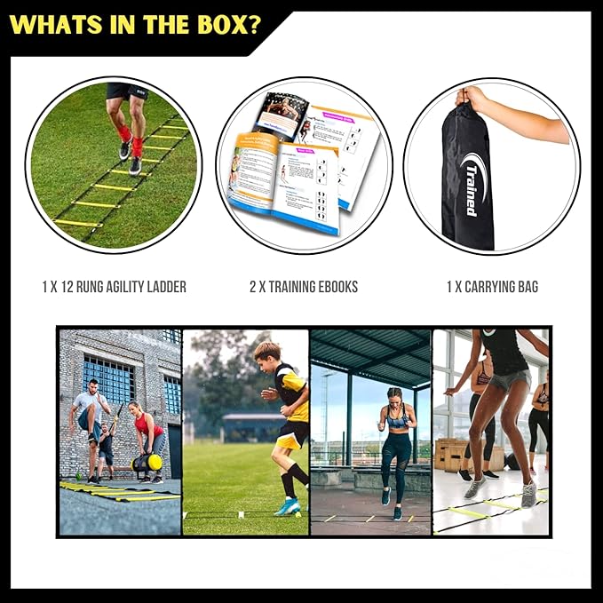 • ⚾ IMPROVE YOUR SPEED, FOOTWORK, SKILL & EXPLOSIVENESS FOR ALL SPORTS: Our speed Ladder kit is a leading tool to workout for adults and kids who want to get in shape or dominate in competitive sports such as soccer, basketball, baseball, football, track and field, tennis, rugby or any sport demanding quickness, acceleration and alertness. The perfect fitness ladder!