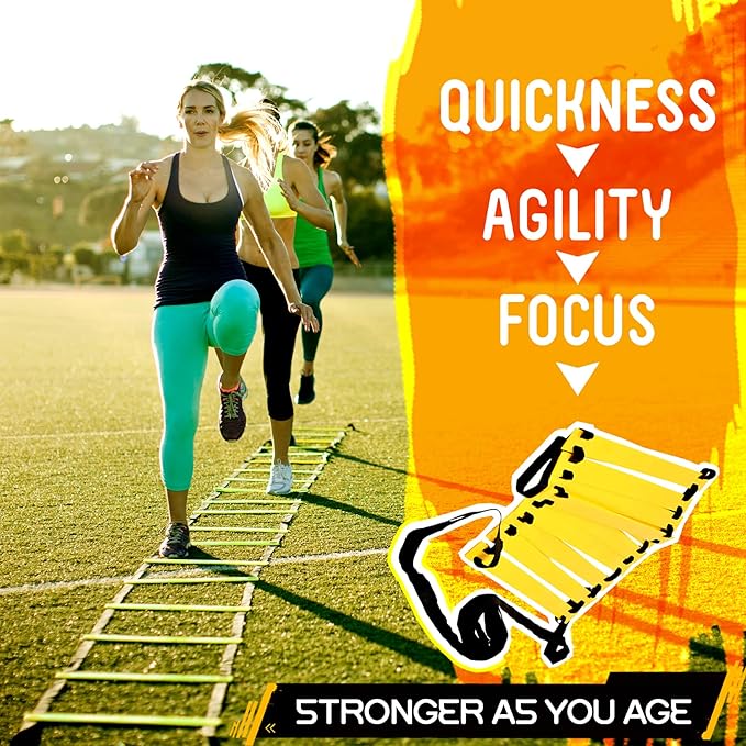 • 💪 STRONGER AS YOU AGE: Great for the elderly, Our workout ladder helps strengthen bones, joints while improving flexibility and balance. Our exercise ladder laser focuses both coordination, balance and brain control as you improve your motor skills with every drill. The fitness benefits will help as well. Our quick ladder, speed and agility ladder, sports ladder, soccer ladder for training,, agility ladder for kids, what ever you want to call it, will do the job!