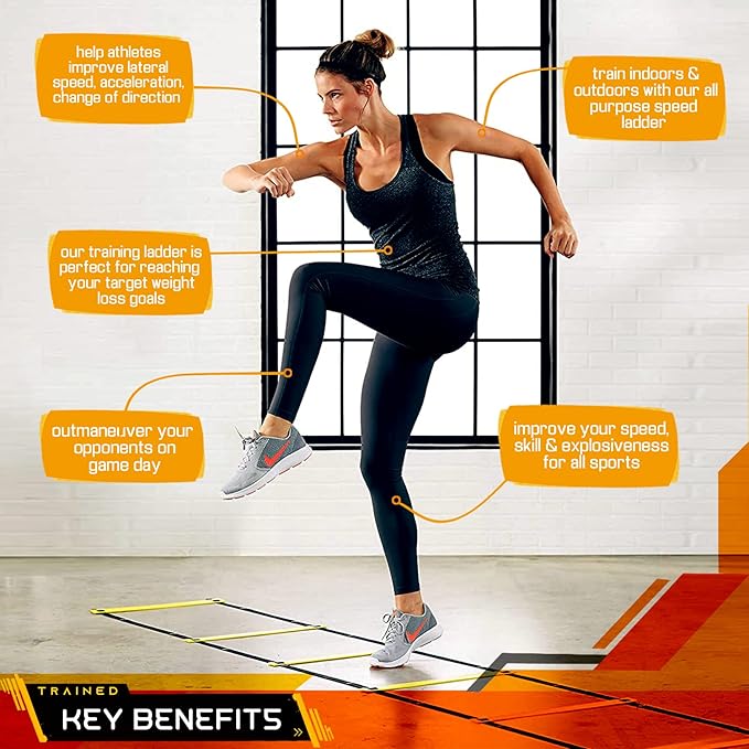 • ⚽ OUR TRAINING LADDER IS PERFECT FOR REACHING YOUR TARGET WEIGHT-LOSS GOALS: Add variation to your workouts with a dynamic exercise plan using our training ladder. Increase your acceleration from a start point using our workout ladder. This agility ladder and cones set will help with safe weight loss while improving your fitness, coordination & cardiovascular health.