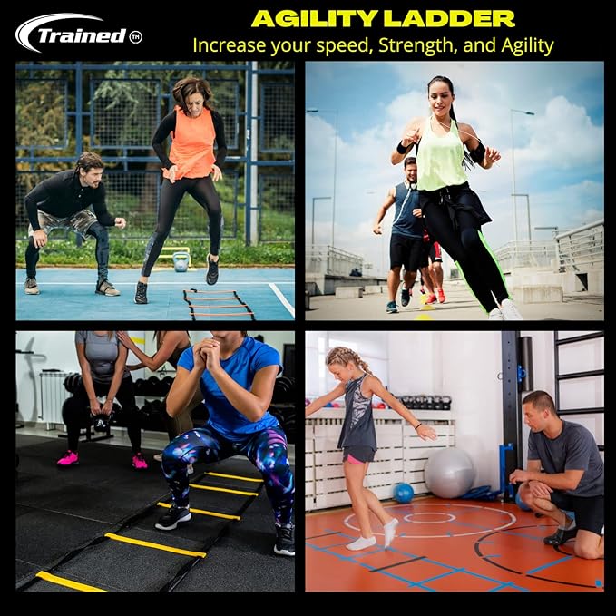 • ⚾ IMPROVE YOUR SPEED, FOOTWORK, SKILL & EXPLOSIVENESS FOR ALL SPORTS: Our speed Ladder kit is a leading tool to workout for adults and kids who want to get in shape or dominate in competitive sports such as soccer, basketball, baseball, football, track and field, tennis, rugby or any sport demanding quickness, acceleration and alertness. The perfect fitness ladder!