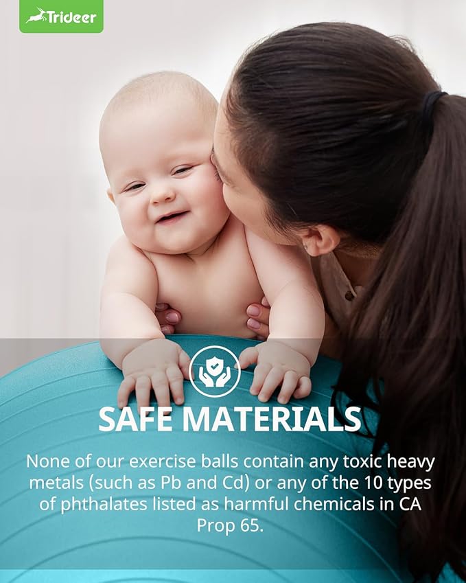 - [High-Quality Material ] -Trideer exercise ball stands out among its peers. Rigorously weight-tested, it effortlessly withstands up to 2200 pounds, catering to individuals with higher body weight. Crafted from sturdy, non-toxic PVC material, it's entirely free from BPA and heavy metals, ensuring a safe choice for pregnant women and babies.