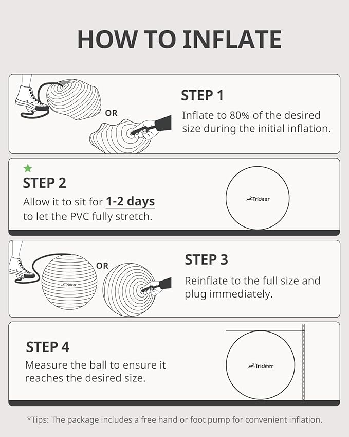 - Inflation Instructions: Let the ball sit for 2-3 days after the initial inflation, then inflate it again to allow it to be stretched to the desired size.
