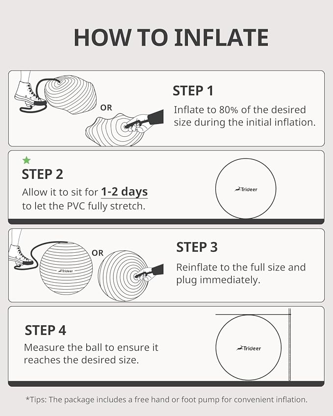 - EASY INFLATION- Trideer exercise ball comes with a quick inflation pump (45/55/65cm equipped with a hand pump; 75/85cm equipped with a foot pump), 2 air stoppers, and detailed instructions; available in 5 sizes to meet all your needs.
