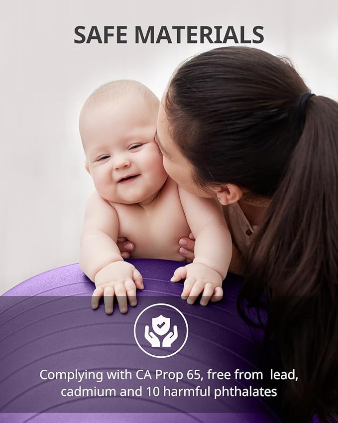 - SAFETY AND COMFORT- The exercise ball is crafted from PVC material; meticulously manufactured to be free from harmful heavy metals such as Pb, Cd, Hg, and 10 other heavy metals; safe for pregnant women and children