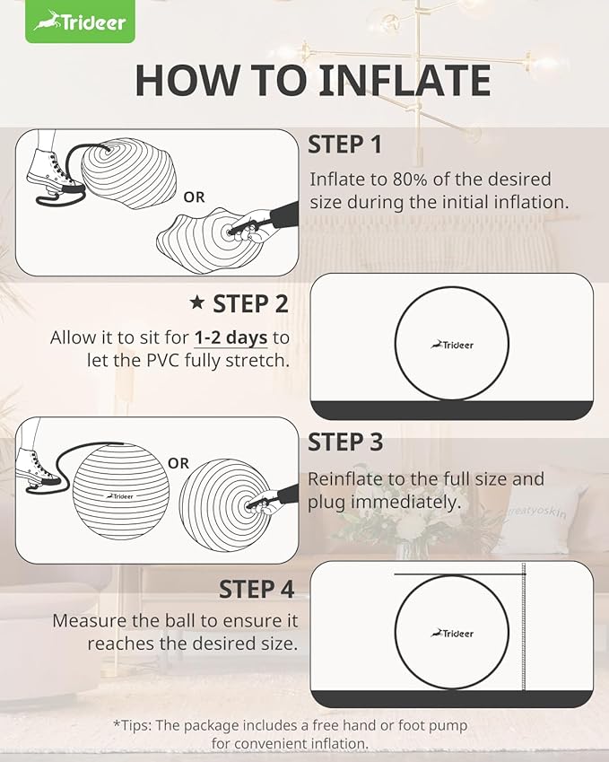 • Inflation Instructions: Let the ball sit for 2-3 days after the initial inflation, then inflate it again to allow it to be stretched to the desired size.