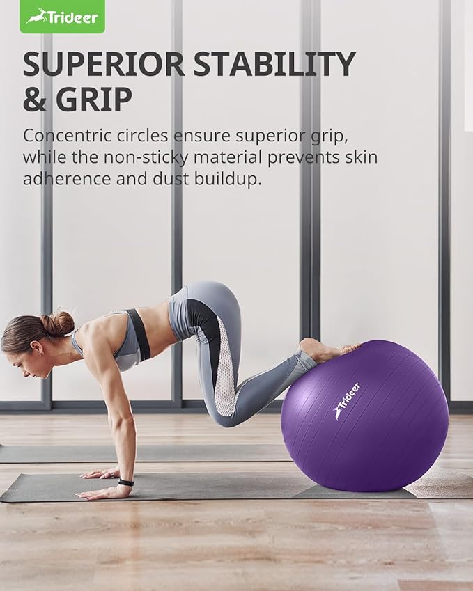 - [Easy Inflation and Perfect Packaging] -Trideer exercise ball comes with a quick inflation pump (45/55/65cm equipped with a hand pump; 75/85cm equipped with a foot pump), 2 air stoppers, and detailed instructions. Available in 5 sizes—45cm, 55cm, 65cm, 75cm, 85cm—to meet all your needs.