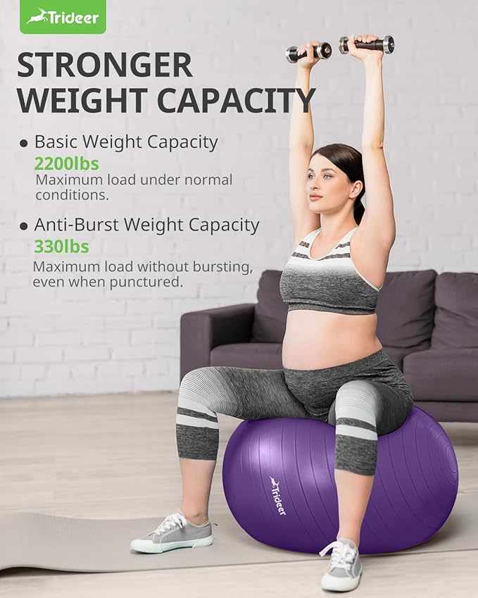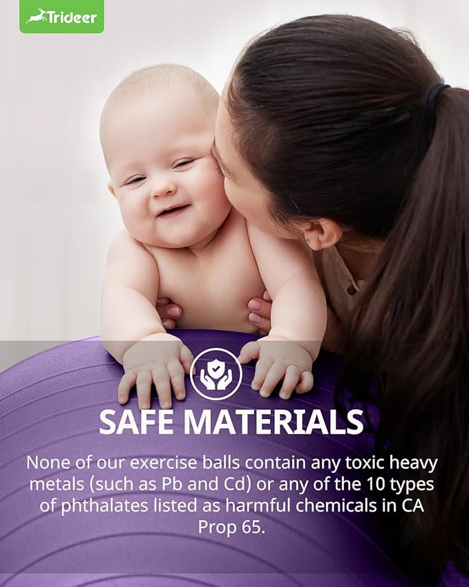- [High-Quality Material ] -Trideer exercise ball stands out among its peers. Rigorously weight-tested, it effortlessly withstands up to 2200 pounds, catering to individuals with higher body weight. Crafted from sturdy, non-toxic PVC material, it's entirely free from BPA and heavy metals, ensuring a safe choice for pregnant women and babies.