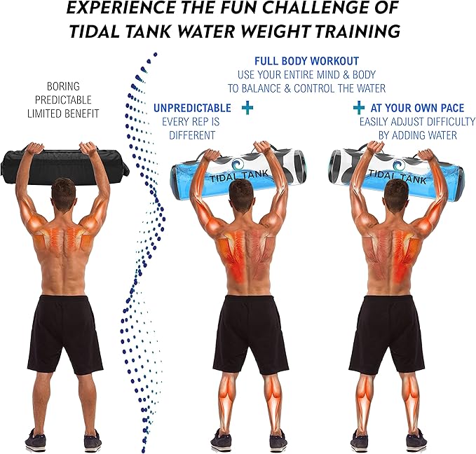 • EXPERIENCE THE FUN CHALLENGE OF A ‘LIVE’ WEIGHT 🌊 In contrast to ‘dead’ sand bag weights, the Tidal Tank reacts to your every movement. Because of this, EVERY REPITITION IS DIFFERENT, asking something different from your muscles and motor control each time. This trains athletes to be robust, promotes muscle growth for the fitness lover, and most of all – according to our customers - is a lot of fun.