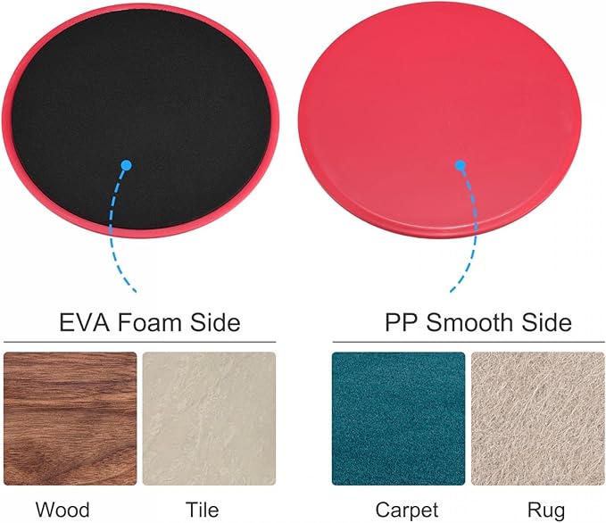 • DOUBLE SIDED DESIGN: The glider disc is in dual-sided design which suits for workout on all surfaces. The durable EVA foam side is for hard floors like wood or tiles, and the PP smooth side can be used on fabric floors like carpets or rugs