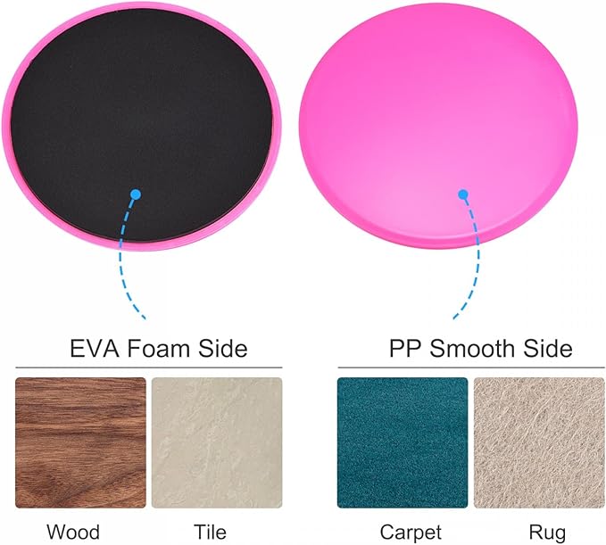 • DOUBLE SIDED DESIGN: The glider disc is in dual-sided design which suits for workout on all surfaces. The durable EVA foam side is for hard floors like wood or tiles, and the PP smooth side can be used on fabric floors like carpets or rugs