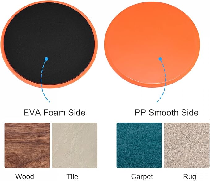 • DOUBLE SIDED DESIGN: The glider disc is in dual-sided design which suits for workout on all surfaces. The durable EVA foam side is for hard floors like wood or tiles, and the PP smooth side can be used on fabric floors like carpets or rugs