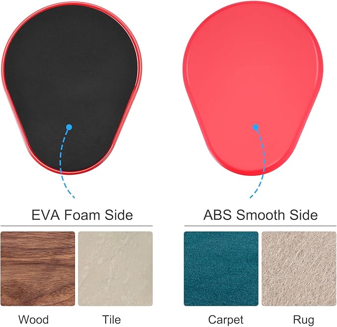 - DOUBLE SIDED DESIGN: The glider disc is in dual-sided design which suits workouts on all surfaces. The durable EVA foam side is for hard floors like wood or tiles, and the ABS smooth side can be used on fabric floors like carpets or rugs