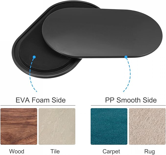 - DOUBLE SIDED DESIGN: The oval glider disc is in dual-sided design which suits workouts on all surfaces. The durable EVA foam side is for hard floors like wood or tiles, and the PP smooth side can be used on fabric floors like carpets or rugs