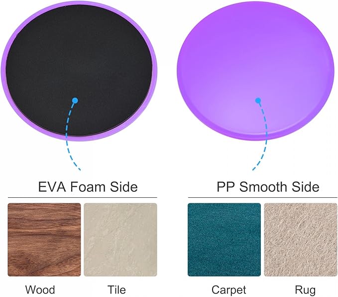 • DOUBLE SIDED DESIGN: The glider disc is in dual-sided design which suits for workout on all surfaces. The durable EVA foam side is for hard floors like wood or tiles, and the PP smooth side can be used on fabric floors like carpets or rugs