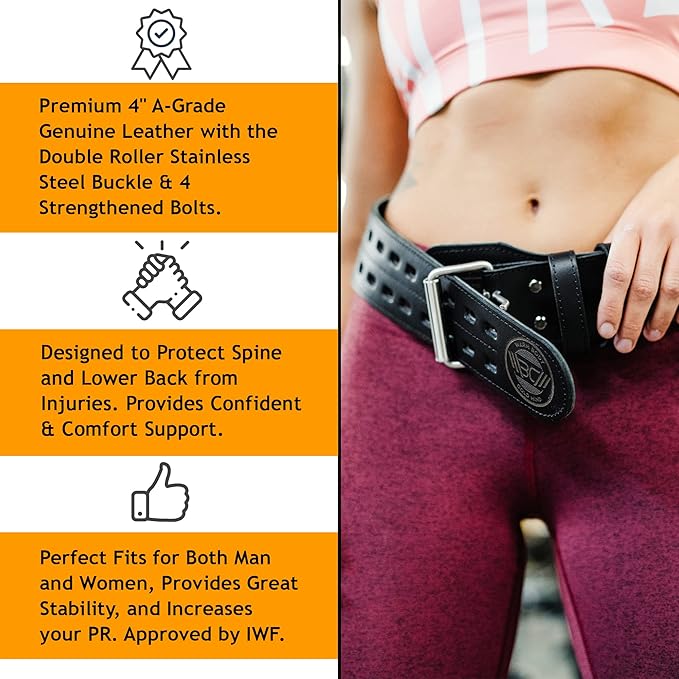 - PREMIUM 4 INCH GENUINE LEATHER WITH THE DOUBLE ROLLER STAINLESS STEEL BUCKLE - Our Functional Workout Belt is treated with two layers of leather for greater protection and durability. 4 Strengthened Bolts prevent slipping and riding of the leather weight lifting belt. The buckle doesn’t have contact with your skin preventing any discomfort