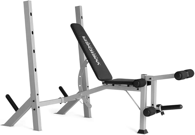 • Olympic Sizing; This weight bench is compatible with 7-foot Olympic barbells and 2” standard weight plates (sold separately); Exercise Chart Included; Learn new routines and proper lifting form