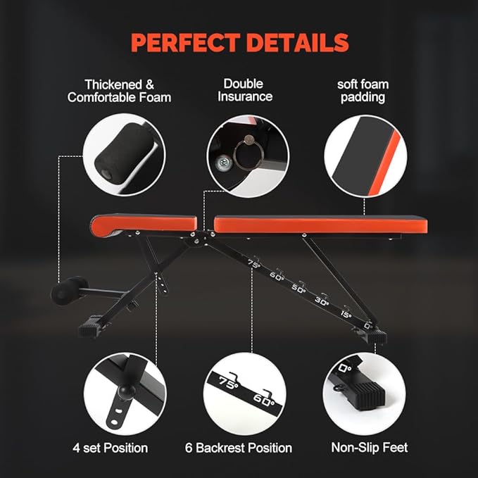 • Versatile Adjustable Workout Bench: The full body exercise bench could be incline decline from flat to 75°backrest, 6 back position, 4 seat postion, 3 foot postion choice for adjust, to meet different stage exercise need.