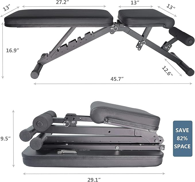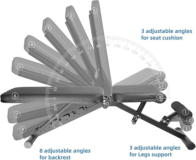 - ADJUSTABLE WEIGHT BENCH: Up to 14 adjustable positions (8 adjustable back pad positions, 3 adjustable seat positions & 3 feet supporter position)